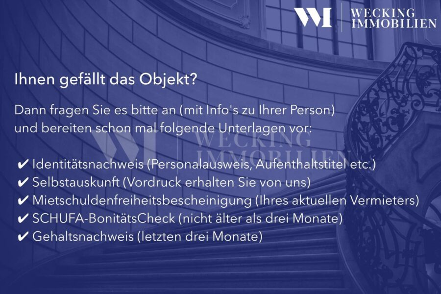 Das Objekt wird über WECKING Immobilien im Makler-Alleinauftrag vermarktet. Alle Angaben sind freibleibend, unverbindlich, ohne Gewähr und basieren ausschließlich auf Informationen, die uns von unserem Auftraggeber oder öffentliche Behörden mitgeteilt wurden. Wir übernehmen keine Gewähr für Vollständigkeit, Richtigkeit und Aktualität.