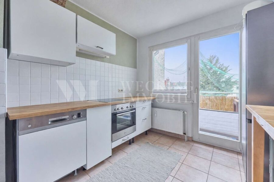 Die Küche ist funktional geschnitten und verfügt über einen direkten Zugang zu einem zweiten Balkon, der zum ruhigen Innenhof ausgerichtet ist – ein idealer Ort für den ersten Kaffee am Morgen oder entspannte Momente im Freien.