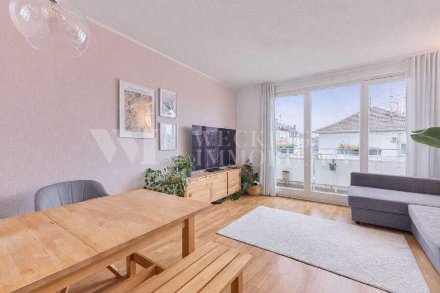 Das Herzstück der Wohnung bildet das großzügige Wohnzimmer mit beeindruckender Fensterfront, die den Raum mit Tageslicht flutet und den Blick nach außen öffnet. Der angrenzende Balkon bietet eine besondere Qualität – mit freier Sicht auf die markante Silhouette einer evangelischen Christuskirche entsteht hier ein atmosphärischer Rückzugsort über den Dächern der Umgebung.